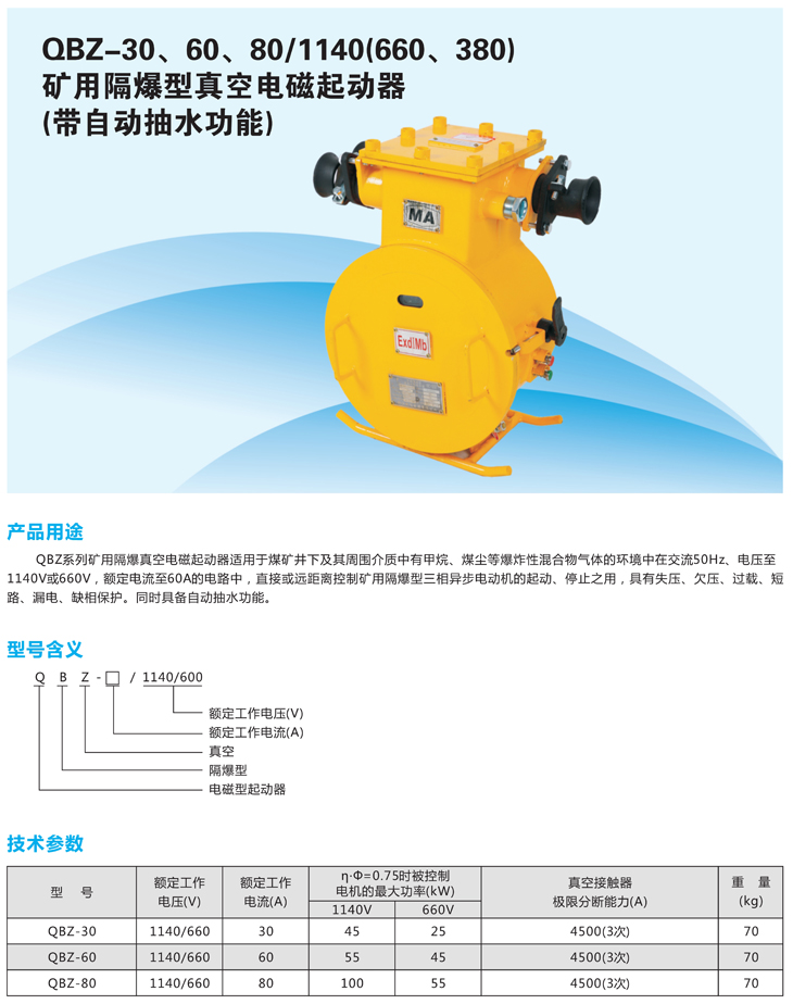 產(chǎn)品總匯>QBZ-30、60、80/1140(660、380)礦用隔爆型真空電磁起動器(帶自動抽水功能)